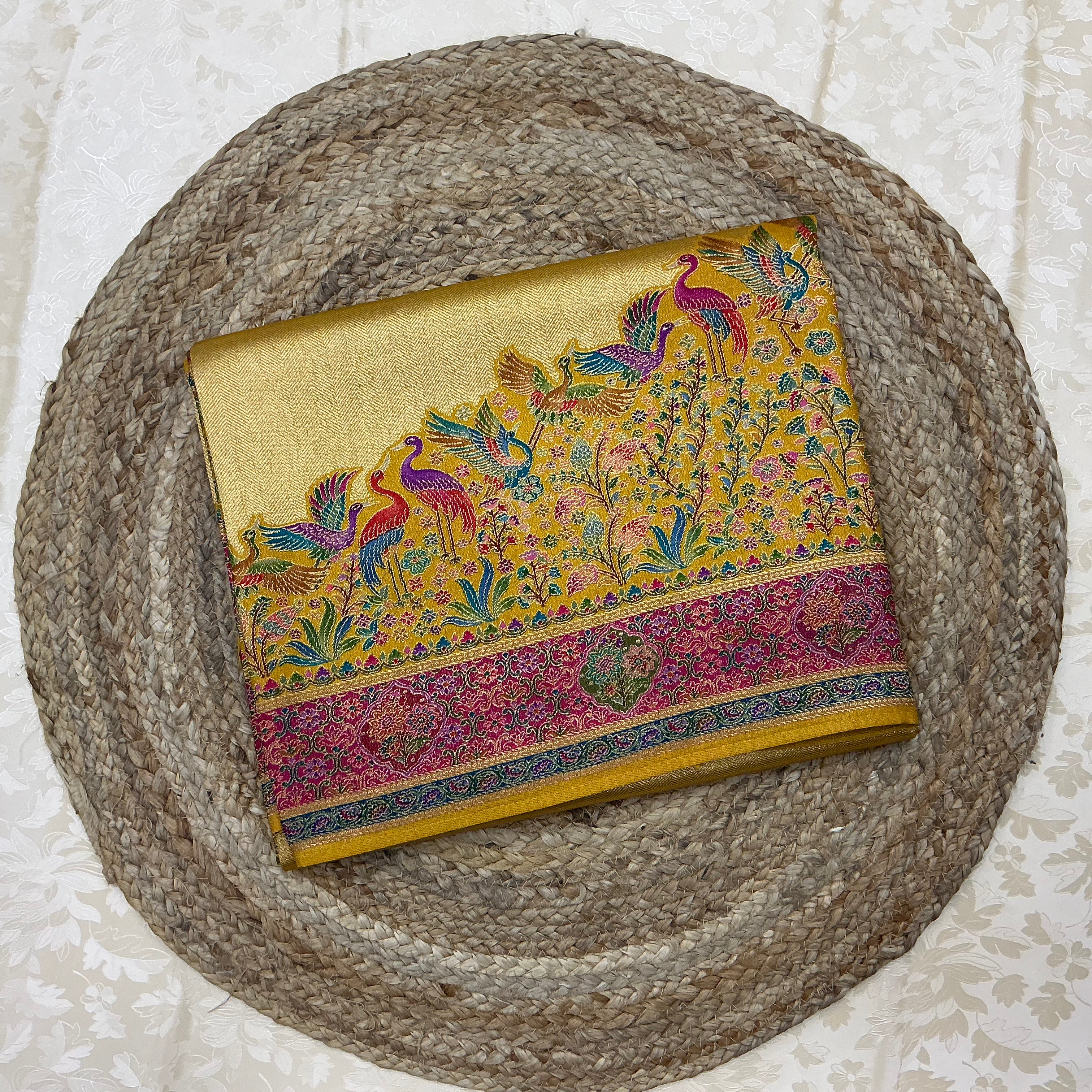 This exquisite Banarasi silk saree is a vibrant celebration of colour and craftsmanship, featuring a rich antique gold body beautifully contrasted with a multi-coloured pallu and border. The saree is adorned with intricate meenakari floral and paisley motifs in shades of ruby pink, emerald green, turquoise blue, and saffron, creating a regal and festive appeal.