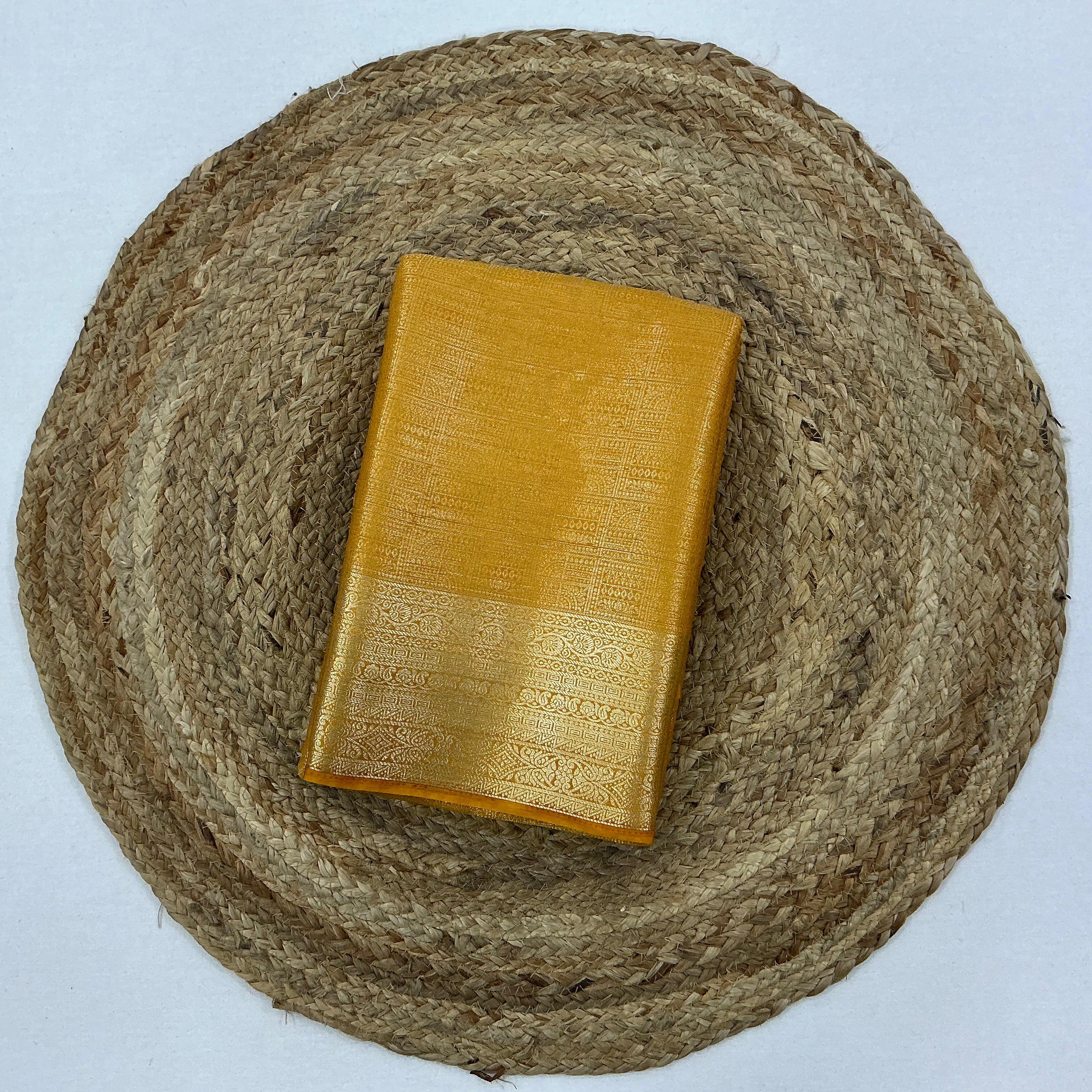 This elegant saree is crafted in rich crepe brocade fabric, known for its smooth texture and graceful, fluid drape. The saree features a classic mustard gold body paired with a rich antique gold tone, woven with fine brocade detailing that creates a warm, regal shimmer.