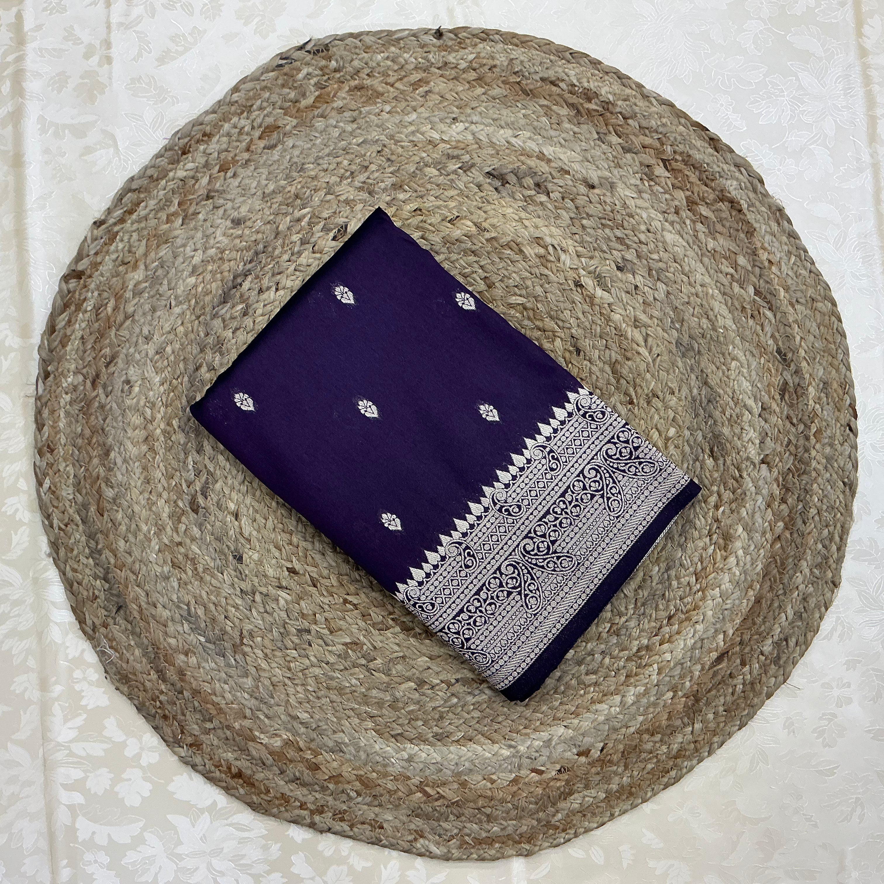A rich purple saree with delicate gold zari buttas, paired with an intricately woven traditional pallu featuring shades of lavender, green, grey, and gold zari. Finished with an elegant gold zari border, this saree beautifully blends classic charm with artistic detailing—perfect for festive and special occasions.