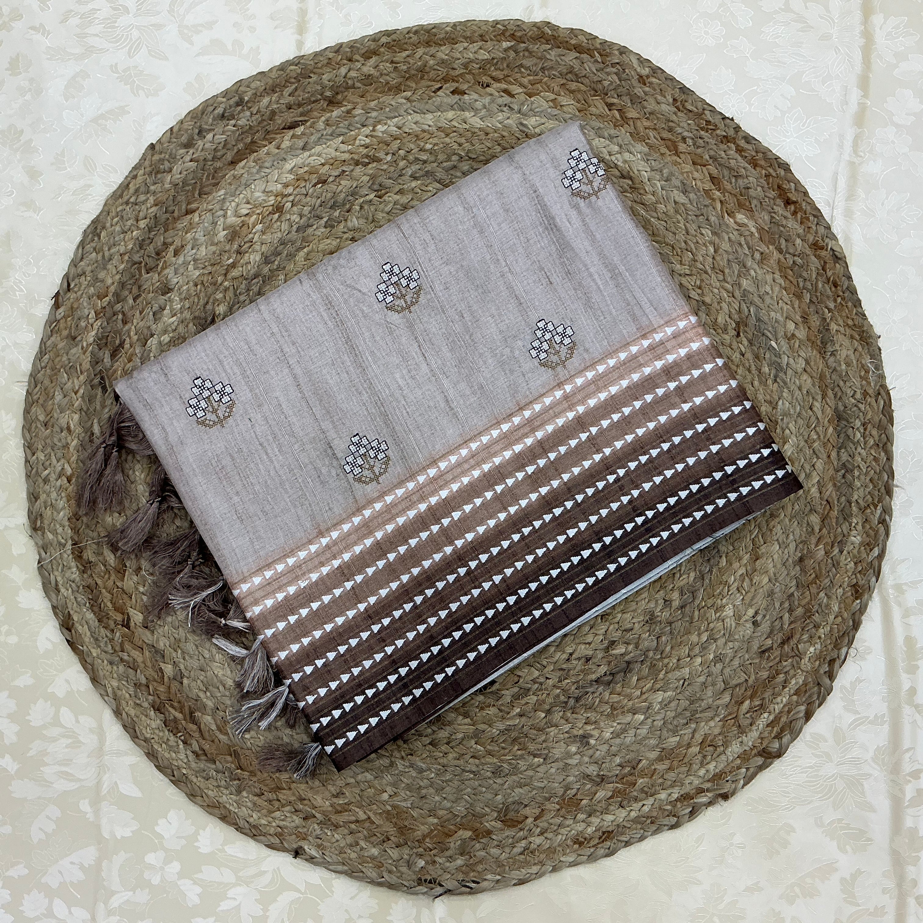 Immerse yourself in the charm of handcrafted elegance with this semi Handloom Tusser Silk Saree in a stunning dual-tone palette of soft beige and coffee brown. The saree is adorned with delicate woven floral motifs across the body, while the contrast pallu in rich coffee brown and ivory highlights enhances its royal appeal. Subtle threadwork detailing and a finely woven striped border complete the look with understated sophistication.
