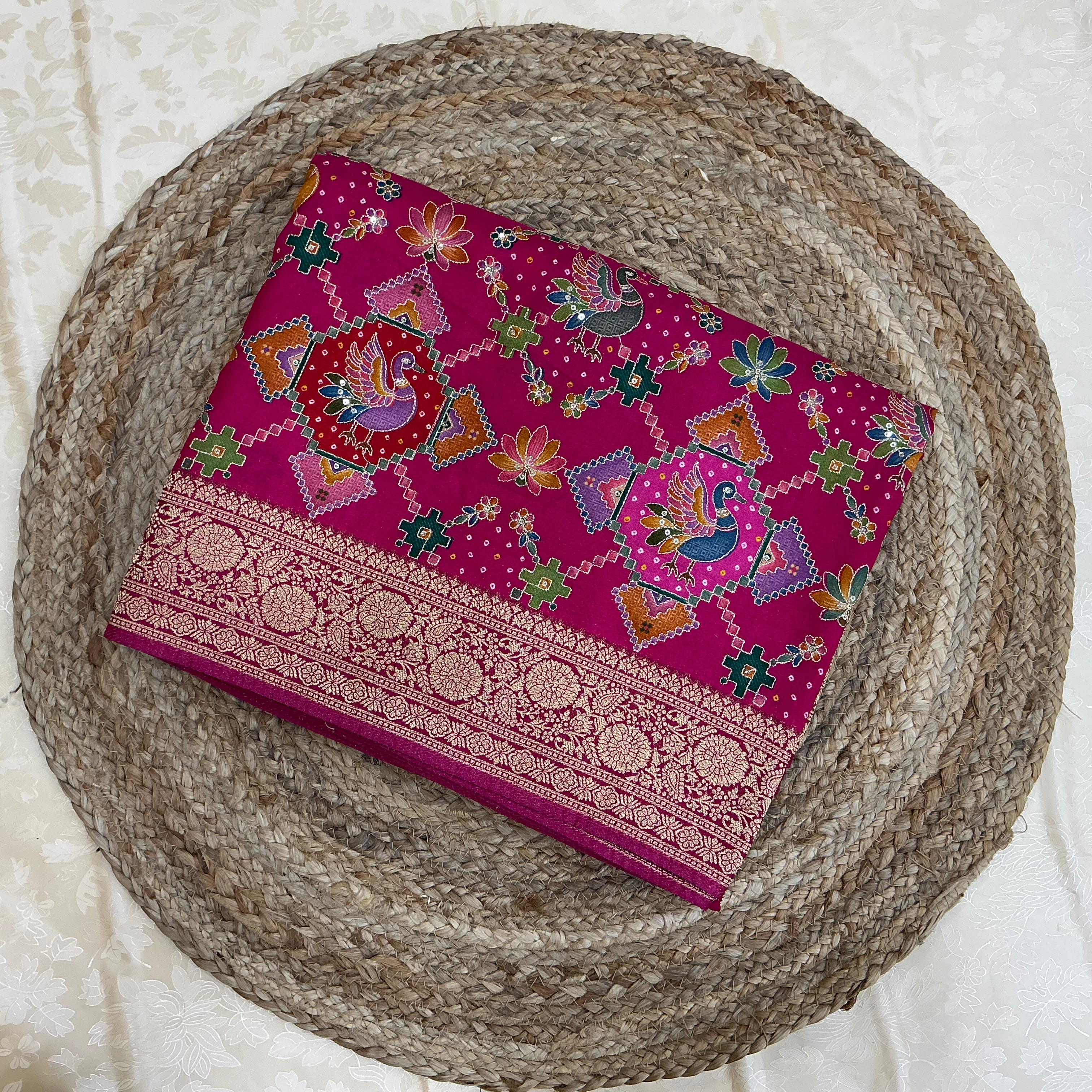 Crafted in a deep rani pink / magenta base, the saree features classic ikat-style woven motifs arranged in a structured geometric grid. The body is beautifully highlighted with vibrant accents of turquoise blue, orange, green, and soft lavender, showcasing stylised floral and bird-inspired patterns that bring a festive, lively appeal. Fine dotted detailing adds texture and depth to the weave.