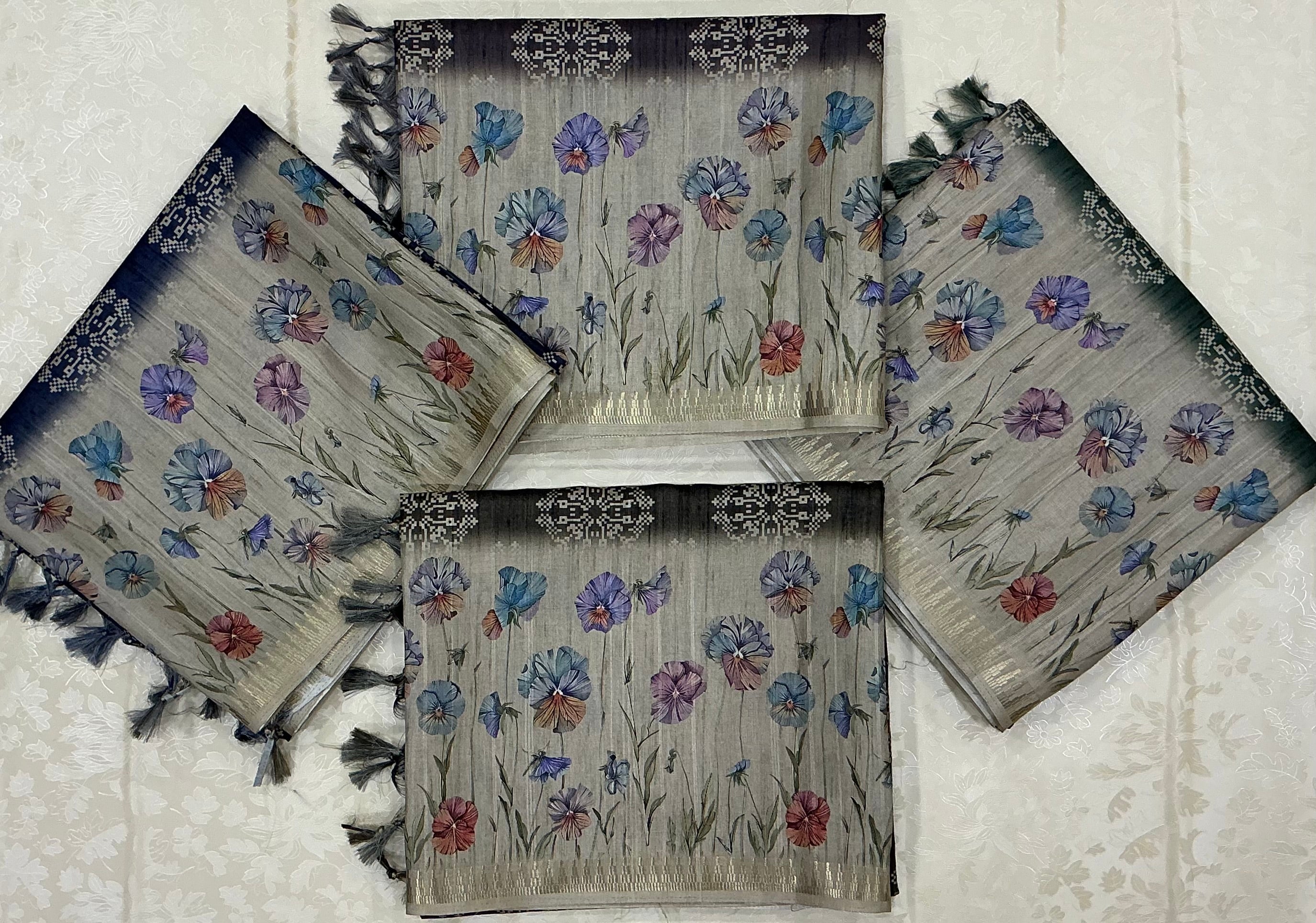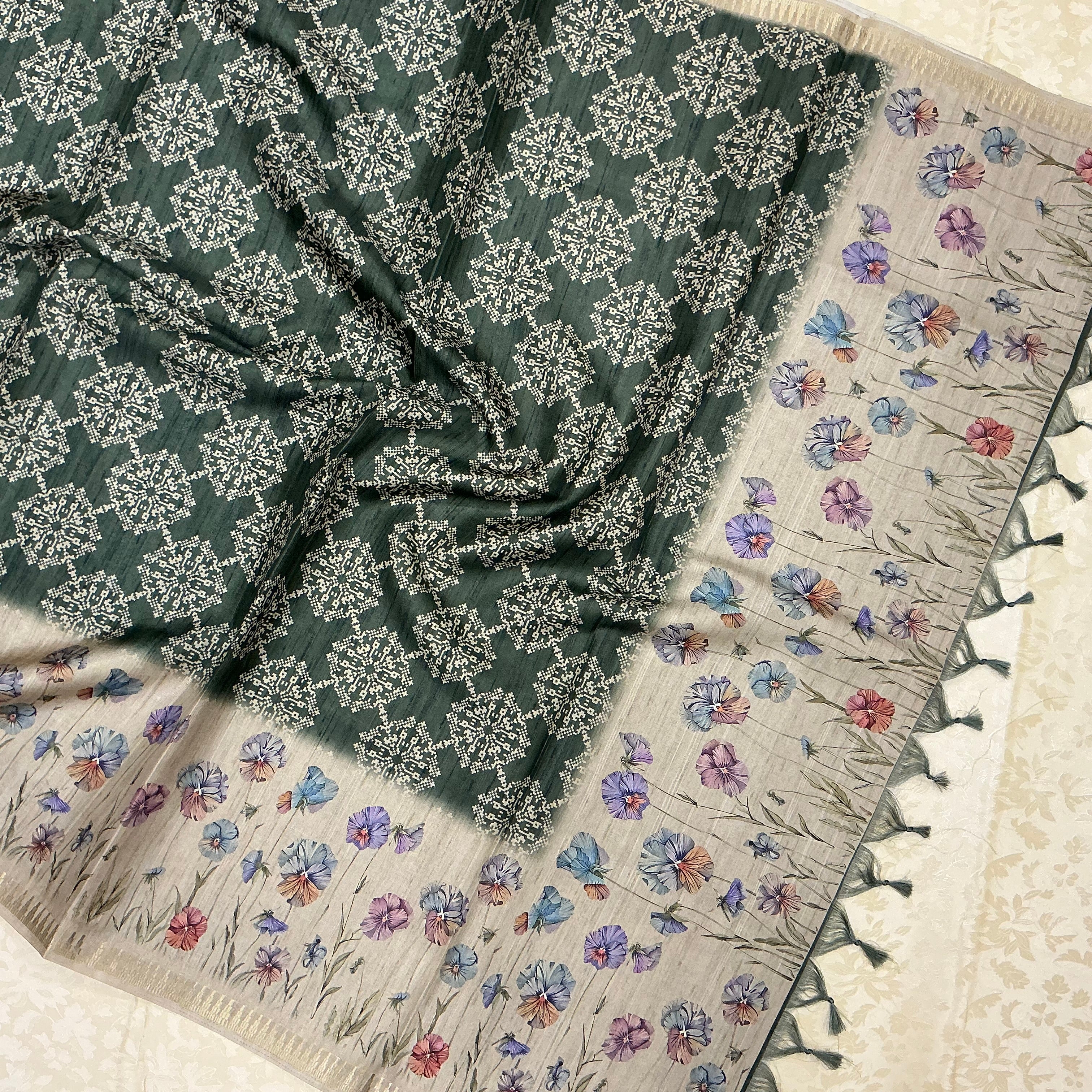 An exquisite fusion saree blending traditional and contemporary artistry. The body features a forest green base adorned with intricate ivory mandala motifs, exuding timeless sophistication. The pallu and border contrast beautifully with a lavender, lilac, blush pink, sky blue, and coral hand-painted with delicate pastel floral blooms in hues of lavender, sky blue, rose pink, and lilac — evoking the charm of a watercolor meadow. Finished with green tassels and a subtle sheen, this saree radiates refined elegance.