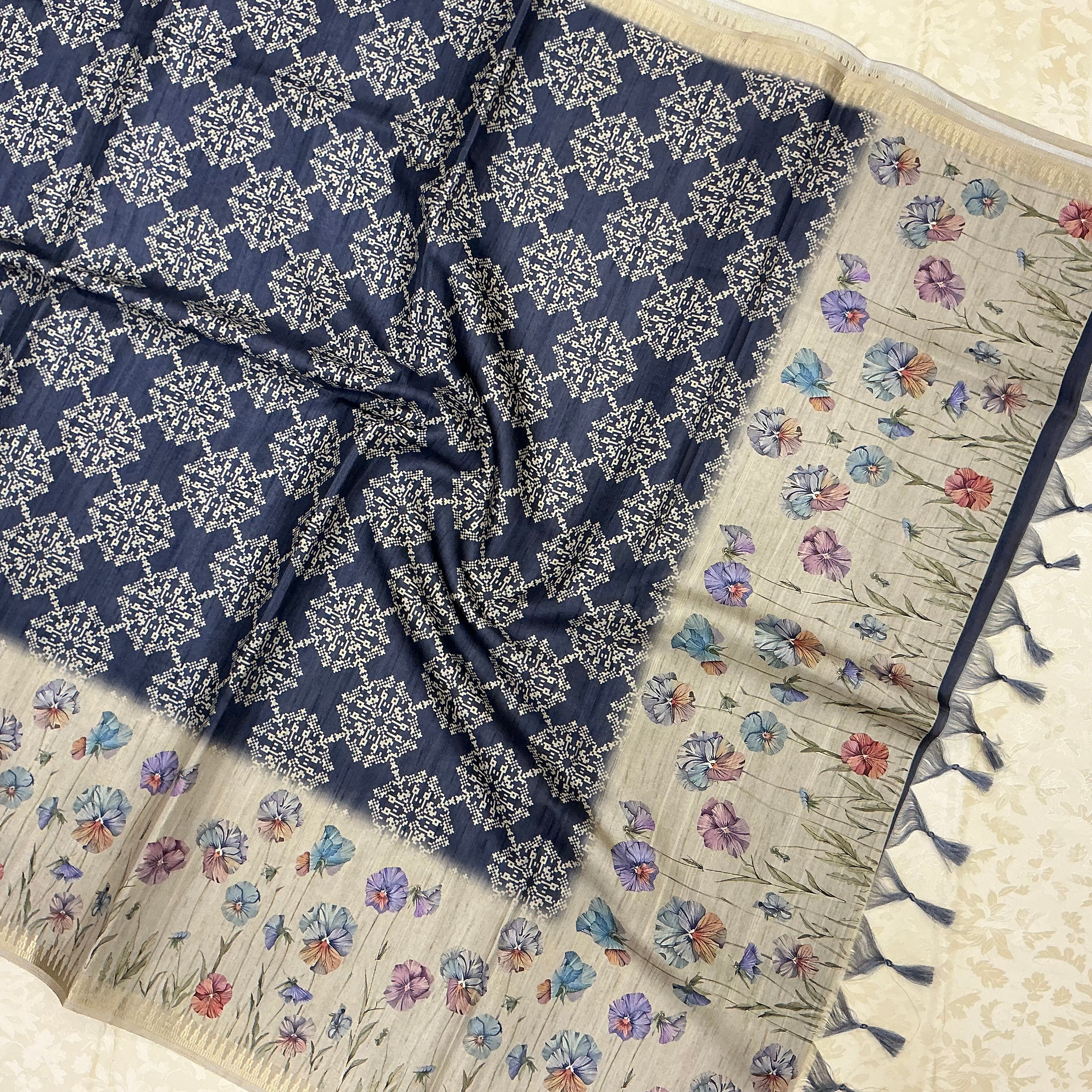 An exquisite fusion saree blending traditional and contemporary artistry. The body features a deep navy blue base adorned with intricate ivory mandala motifs, exuding timeless sophistication. The pallu and border contrast beautifully with a lilac, sky blue, blush pink, and lavender hand-painted with delicate pastel floral blooms in hues of lavender, sky blue, rose pink, and lilac — evoking the charm of a watercolor meadow. Finished with navy tassels and a subtle sheen, this saree radiates refined elegance.
