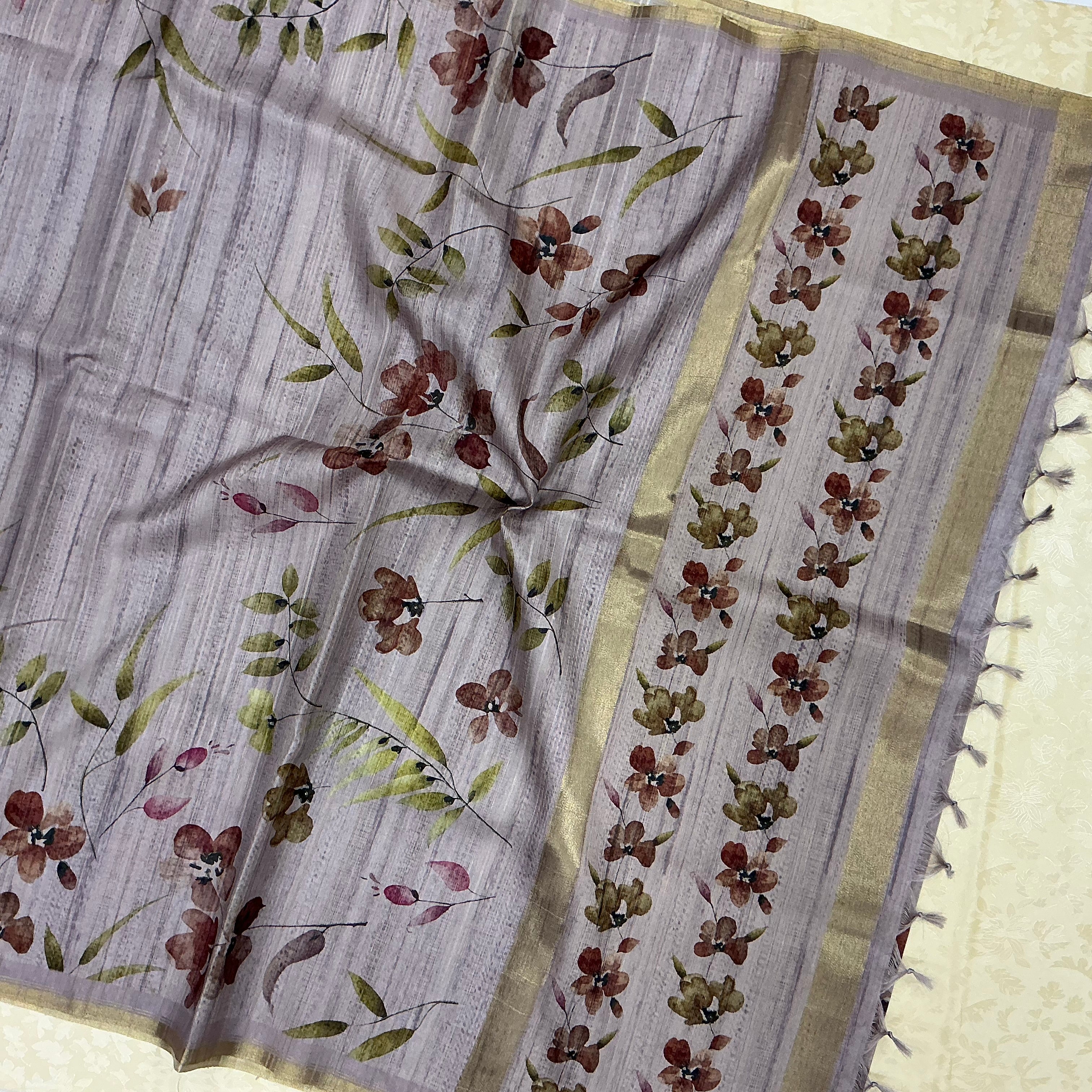An elegant hand-painted saree featuring a pastel lilac-grey base with subtle vertical texture lines that give it a fluid, natural drape. The saree is beautifully adorned with watercolor-style floral motifs in shades of maroon, mauve, olive green, and blush pink, gracefully scattered across the body. The pallu showcases a stunning alignment of small floral patterns that enhance its handcrafted charm, finished with a gold zari border and matching lilac tassels for a refined look.