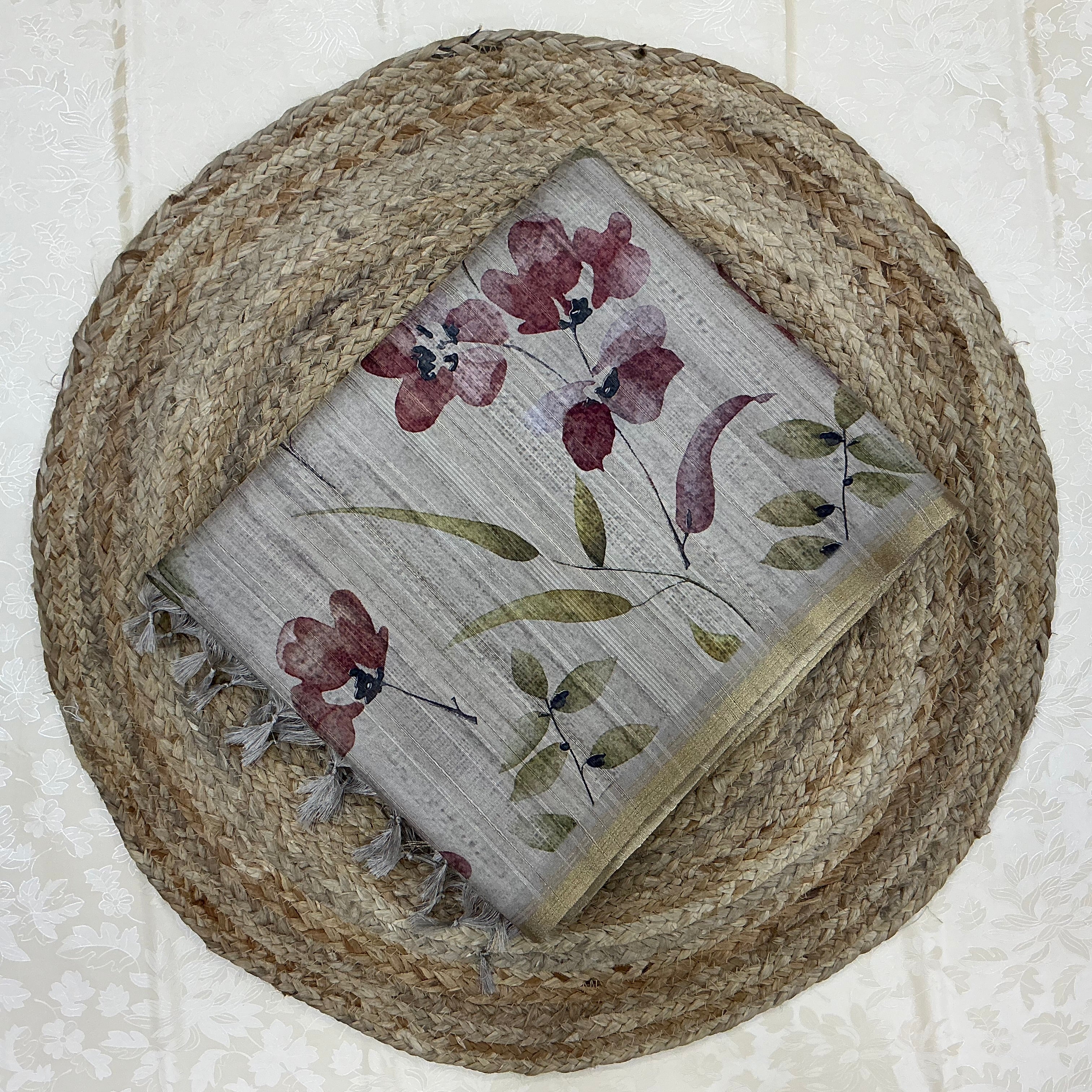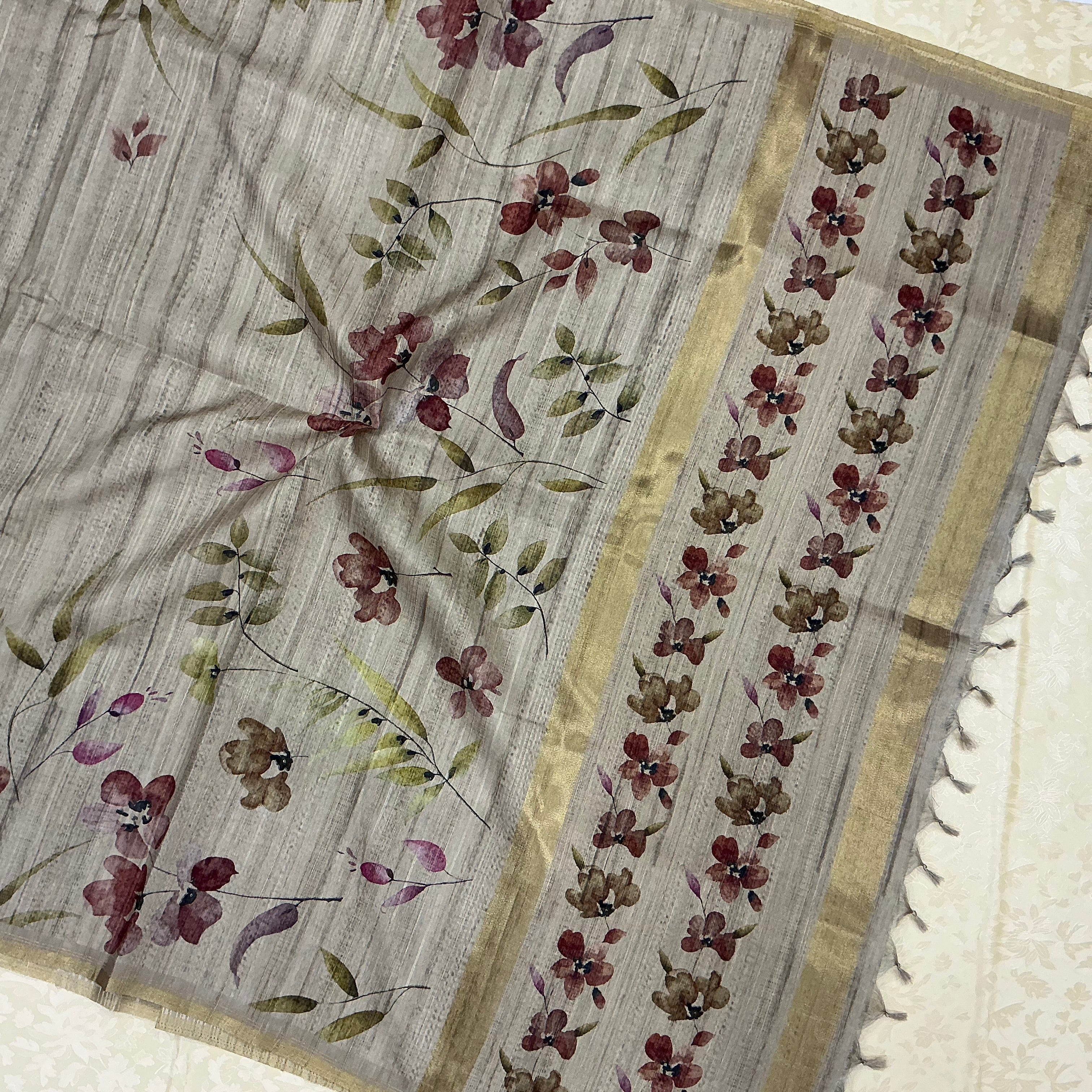 An elegant hand-painted saree featuring a warm beige-grey base with subtle vertical texture lines that give it a fluid, natural drape. The saree is beautifully adorned with watercolor-style floral motifs in shades of wine, maroon, rose, and olive green, gracefully scattered across the body. The pallu showcases a stunning alignment of small floral patterns that enhance its handcrafted charm, finished with a gold zari border and matching sage tassels for a refined look.