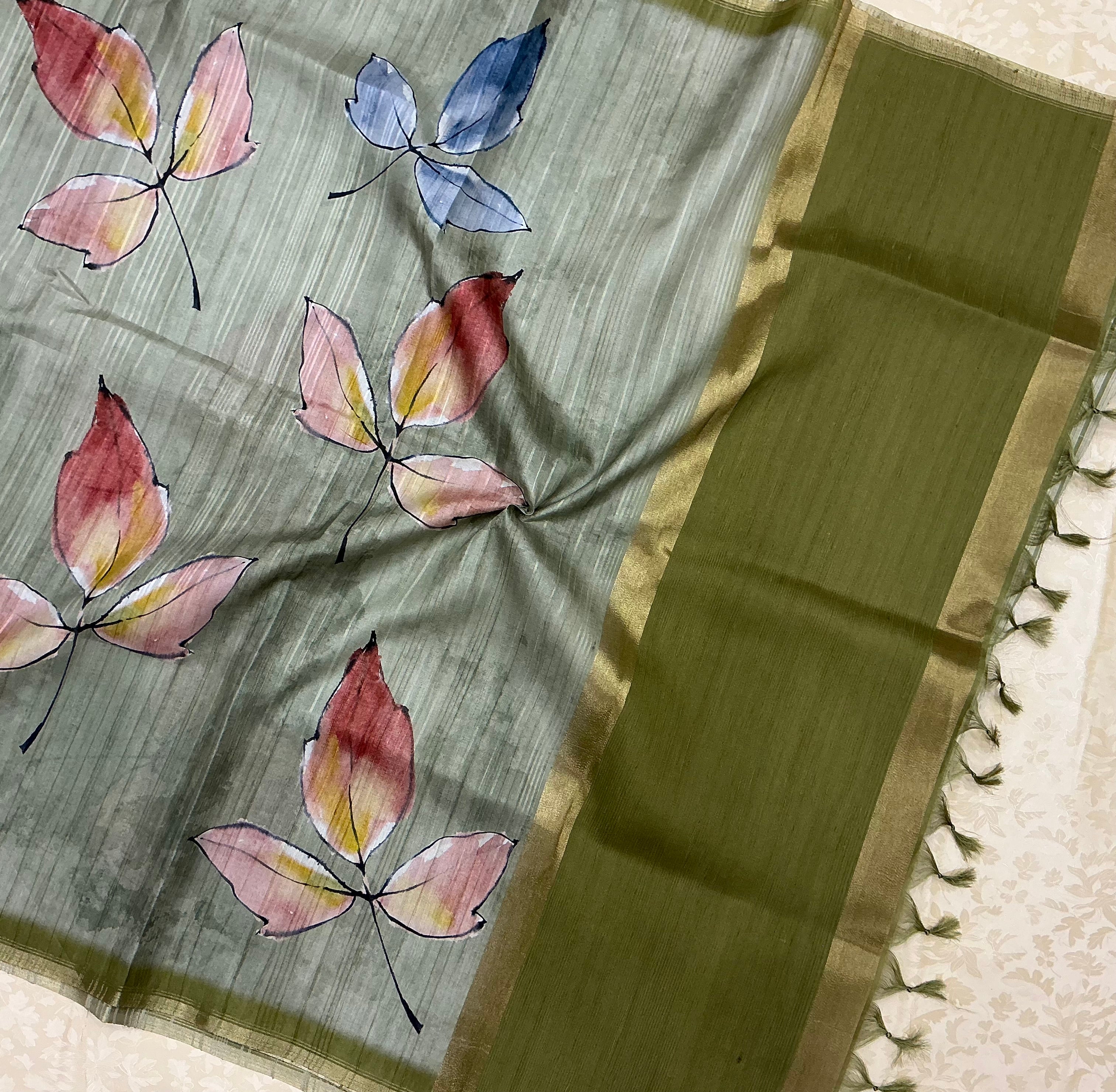 An elegant hand-painted saree that beautifully blends minimalism with artistry. The soft sage green body serves as a serene backdrop for expressive watercolor-style leaf motifs in refreshing shades of blush pink, coral rose, soft yellow, and powder blue, bringing a gentle, nature-inspired poetry to the drape.