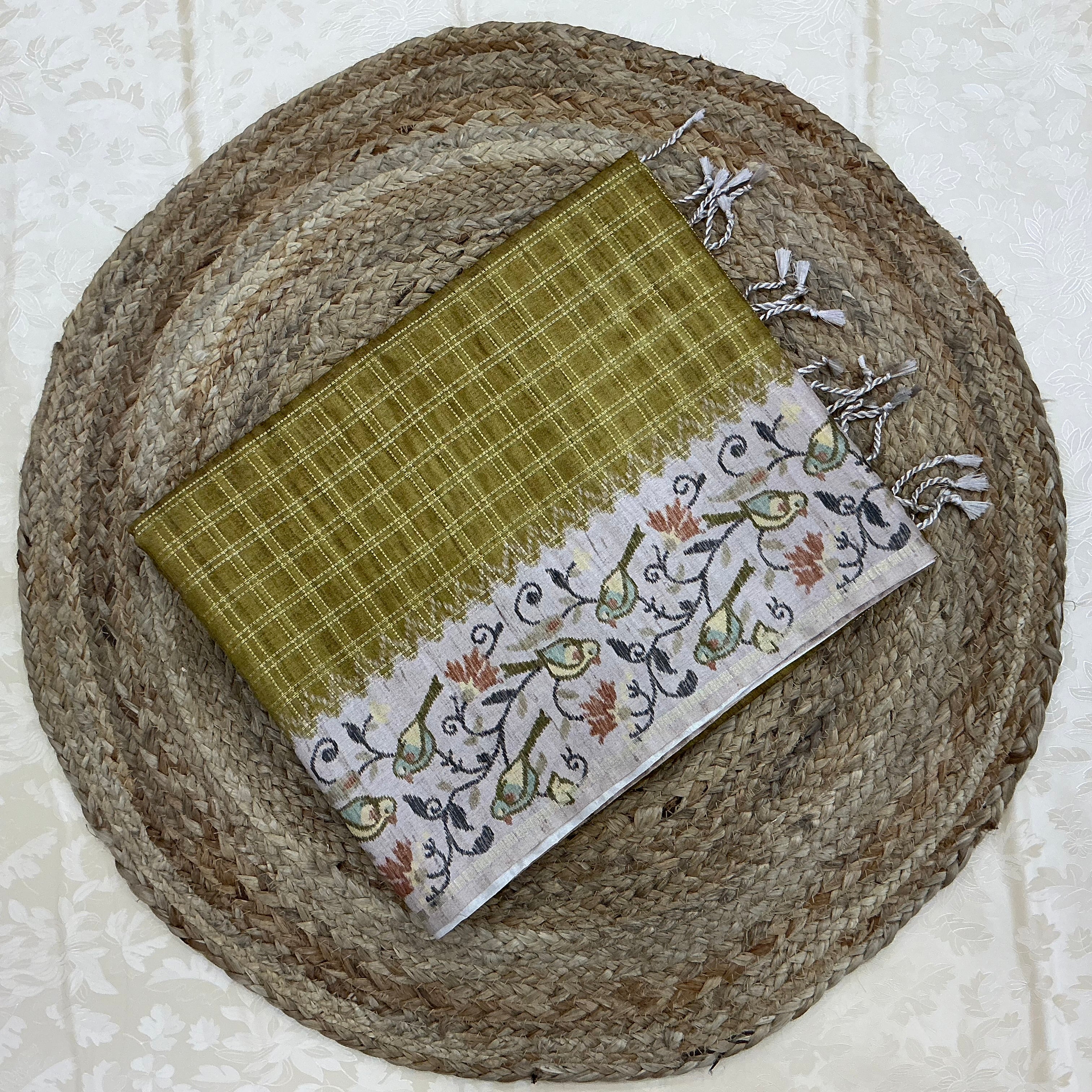 Experience the perfect blend of elegance and artistry with this exquisite Semi Handloom Tusser Silk Saree in a striking olive green. The body features a refined checked weave, while the highlight lies in its beautifully woven pallu printed with vibrant bird and floral ikkat motifs in shades of olive green, mustard, rust orange, and black — symbolizing grace and nature’s charm.