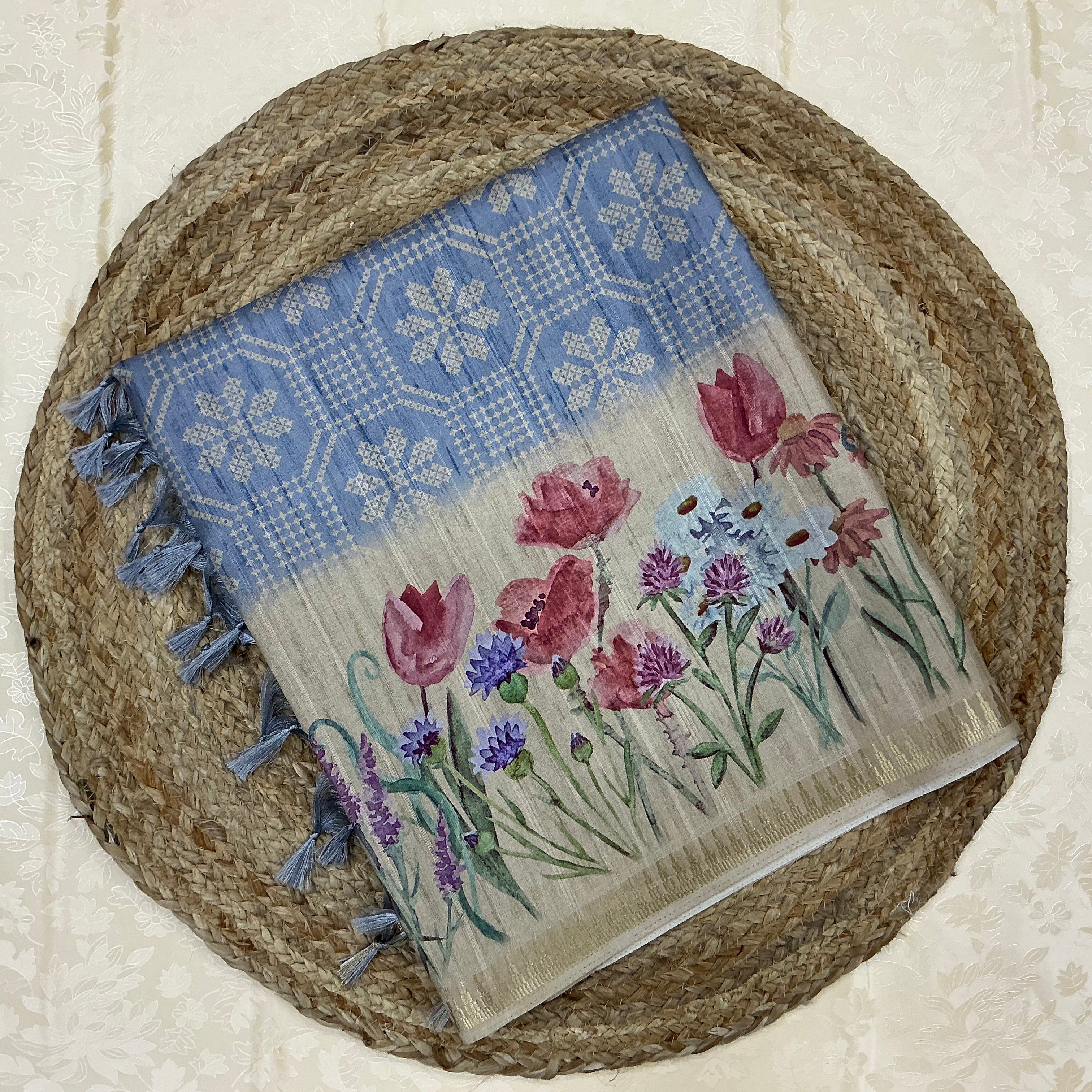 An exquisite fusion saree blending traditional and contemporary artistry. The body features a deep powder blue base adorned with ivory floral hexagonal motifs, exuding timeless sophistication. The pallu and border contrast beautifully with a rose pink, violet, lilac, and soft blue, hand-painted with delicate pastel floral blooms in hues of lavender, sky blue, rose pink, and lilac — evoking the charm of a watercolor meadow. Finished with blue tassels and a subtle sheen, this saree radiates refined elegance.