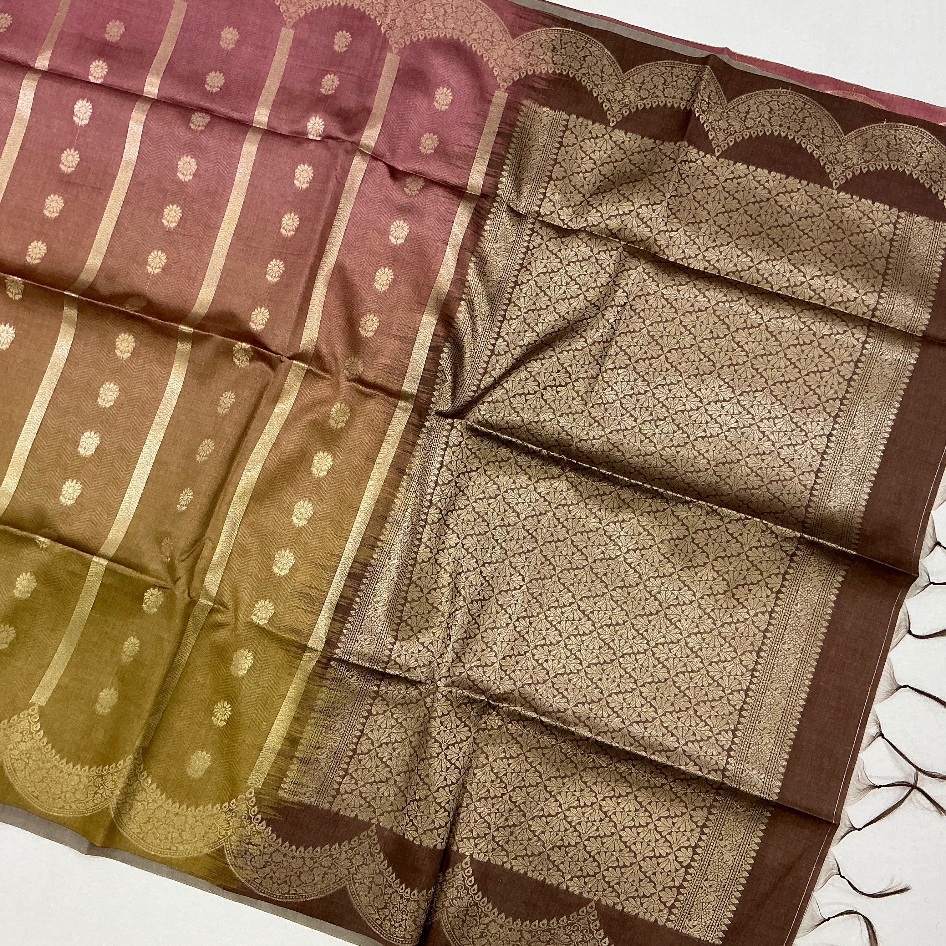 This elegant Tussar silk saree features a rich shaded blend of bronze ombre transitioning into soft , beautifully paired with a deep brown pallu and border. The warm bronze ombre tones create a graceful base, while the bronze adds depth and a regal contrast, enhancing the overall sophistication of the saree.
