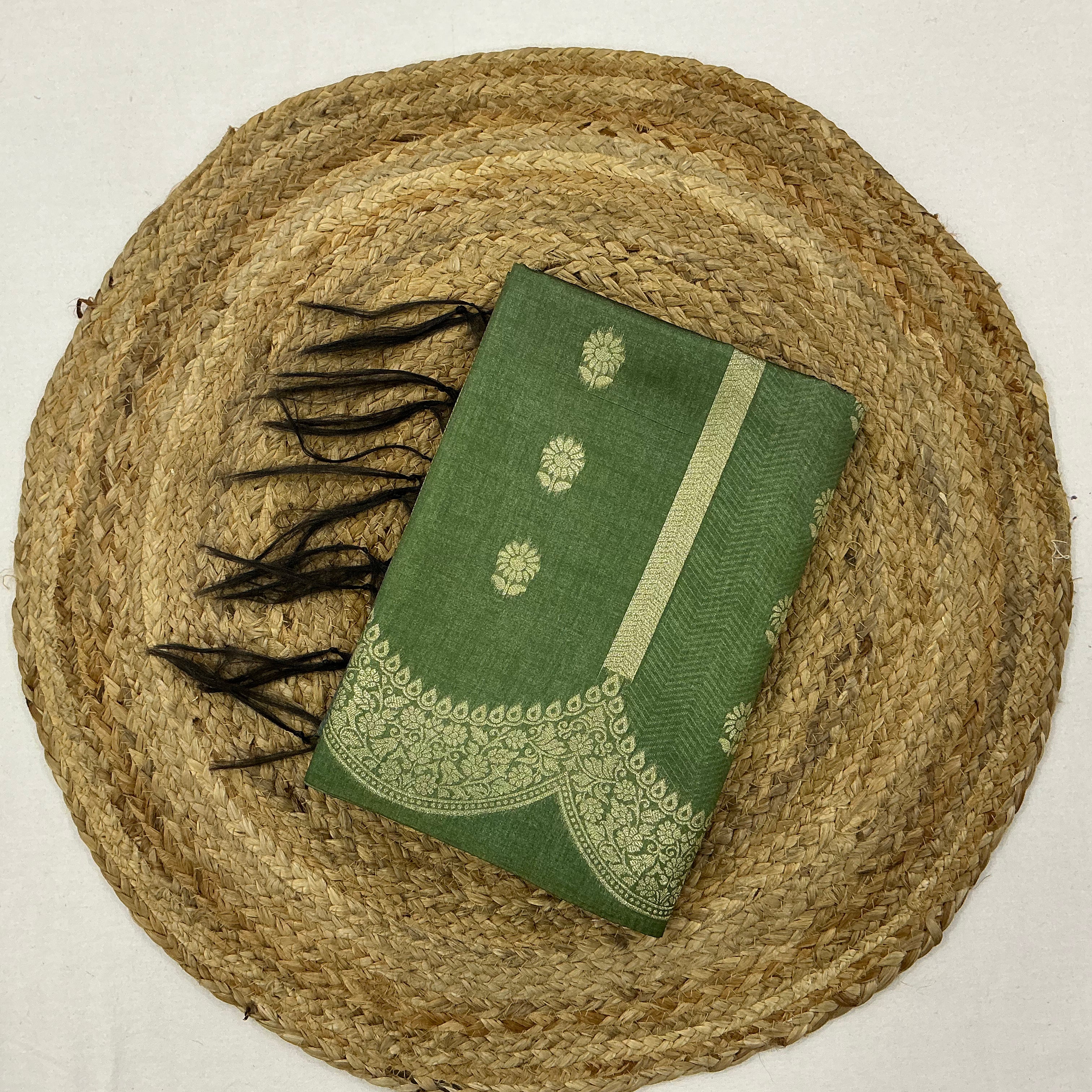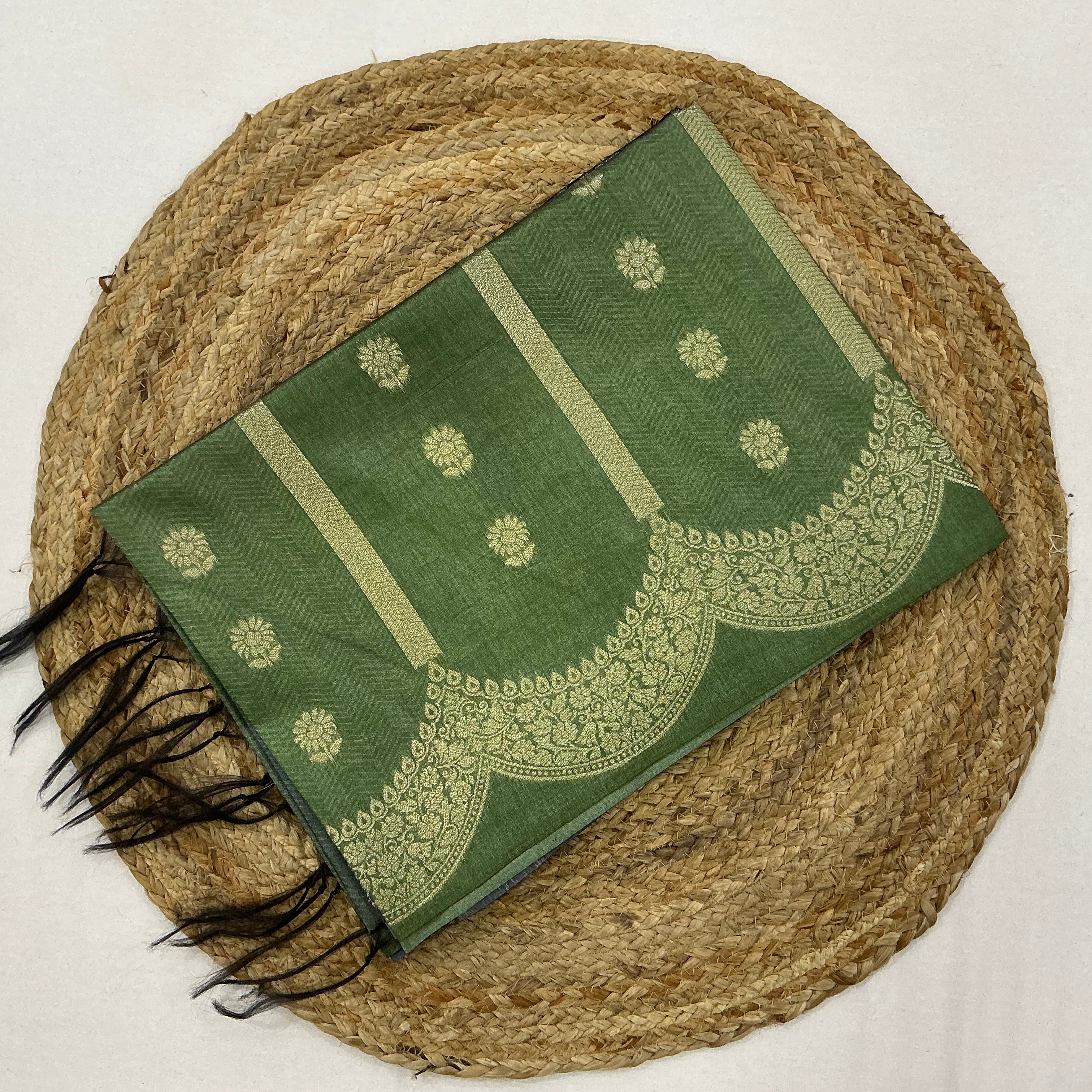 This exquisite Tussar silk saree showcases a soothing shaded blend of olive green and soft grey, beautifully transitioning into a rich navy blue pallu and border. The earthy green tones bring a natural elegance, while the cool grey adds a refined balance, perfectly complemented by the deep navy blue contrast that enhances the overall richness of the saree.