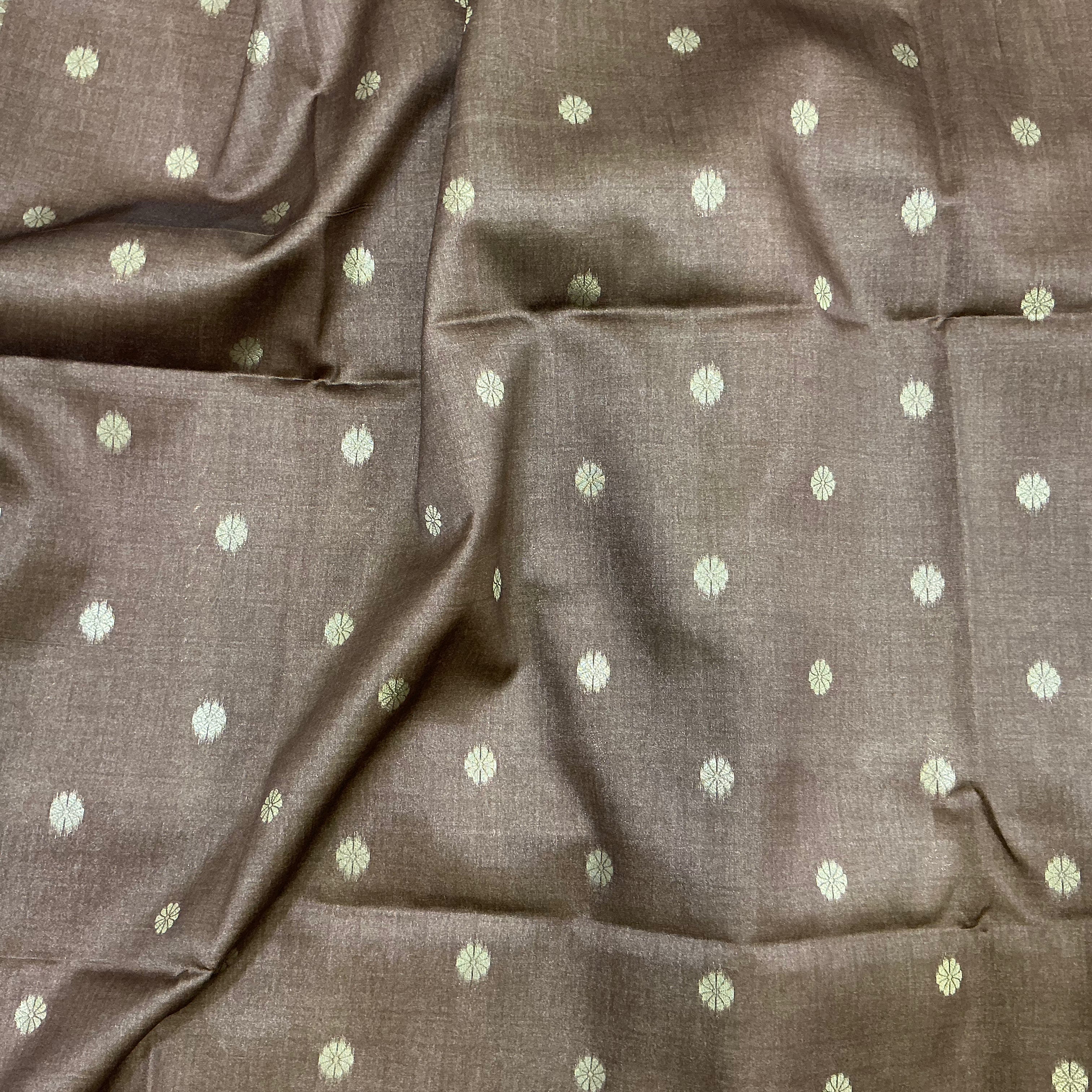 Intricate zari work in a soft gold tone is woven across the saree, featuring delicate motifs and an ornate border that adds a graceful shimmer. The subtle sheen of zari against the muted yet striking color palette highlights the handcrafted charm of authentic Tussar silk.