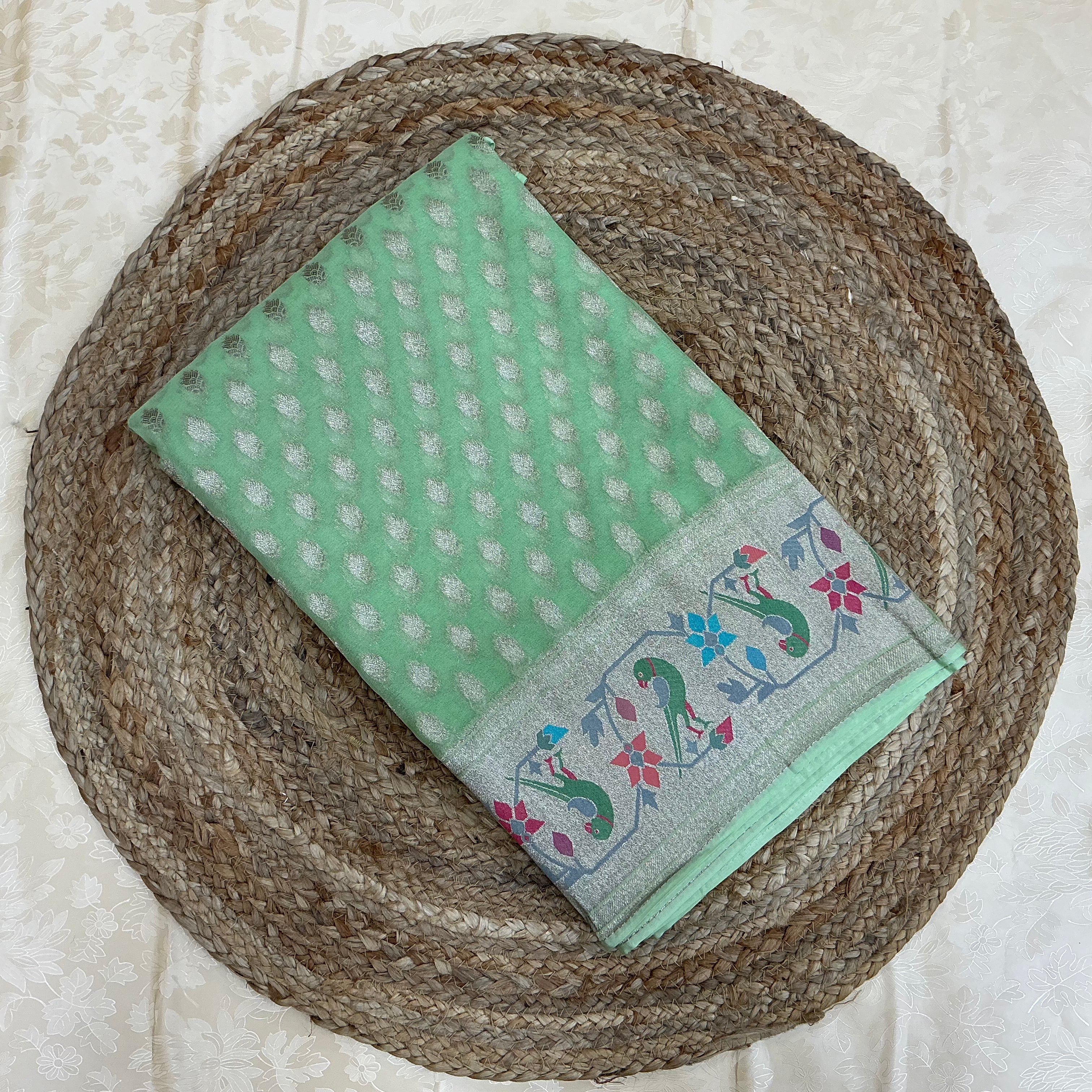 This elegant Paithani saree is crafted in pure viscose fabric, offering a soft, fluid drape with a gentle natural sheen. The saree features a fresh mint green / soft pista green body embellished with delicate all-over woven silver buttis, creating a serene and graceful look.