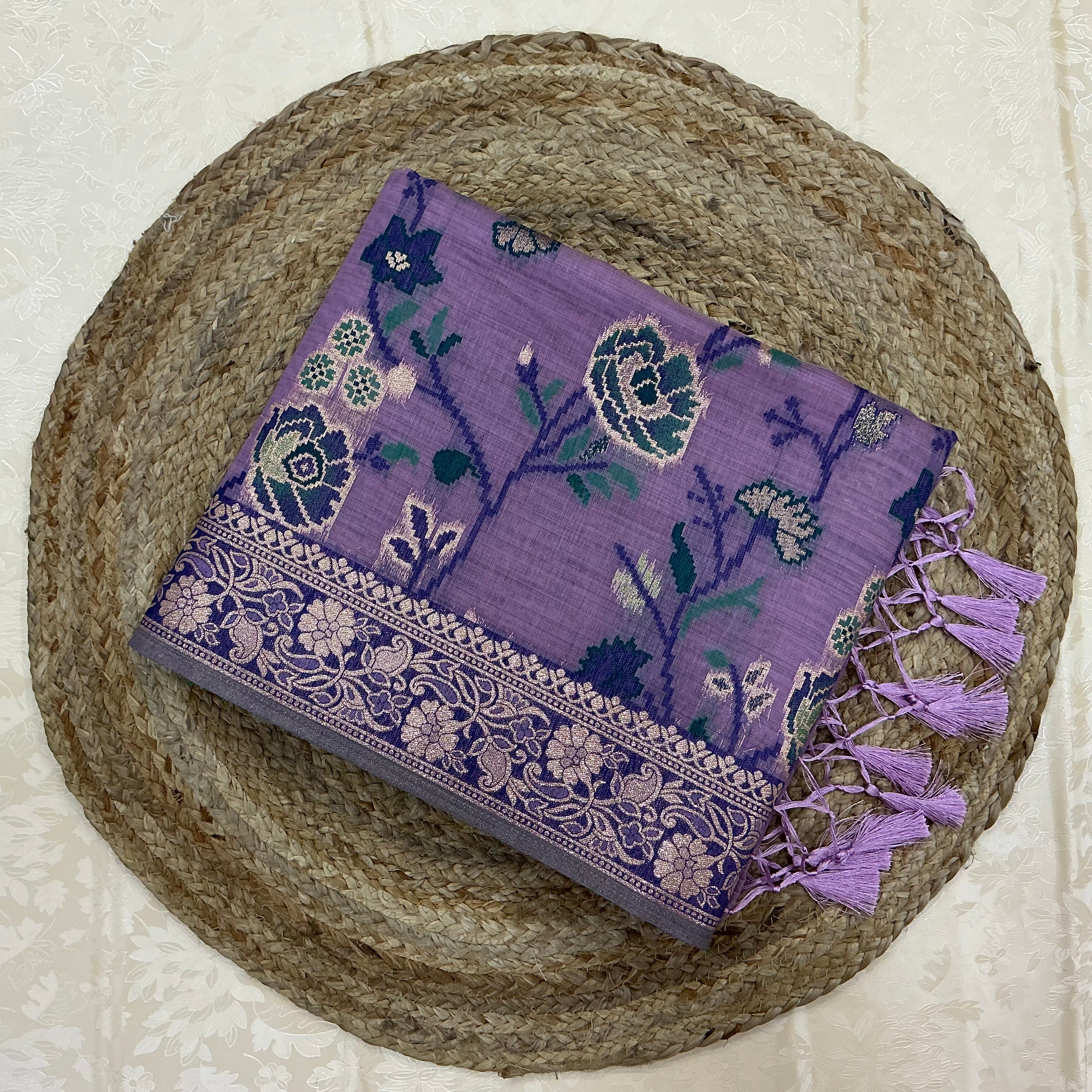This exquisite moga cotton saree comes in a luxurious lavender–orchid purple shade that exudes sophistication and feminine grace. The body features beautifully woven floral jaal motifs in hues of emerald green, deep navy, off-white, and teal,, creating a charming tapestry of blooming vines. The subtle texture of the fabric adds depth and a refined handloom finish.