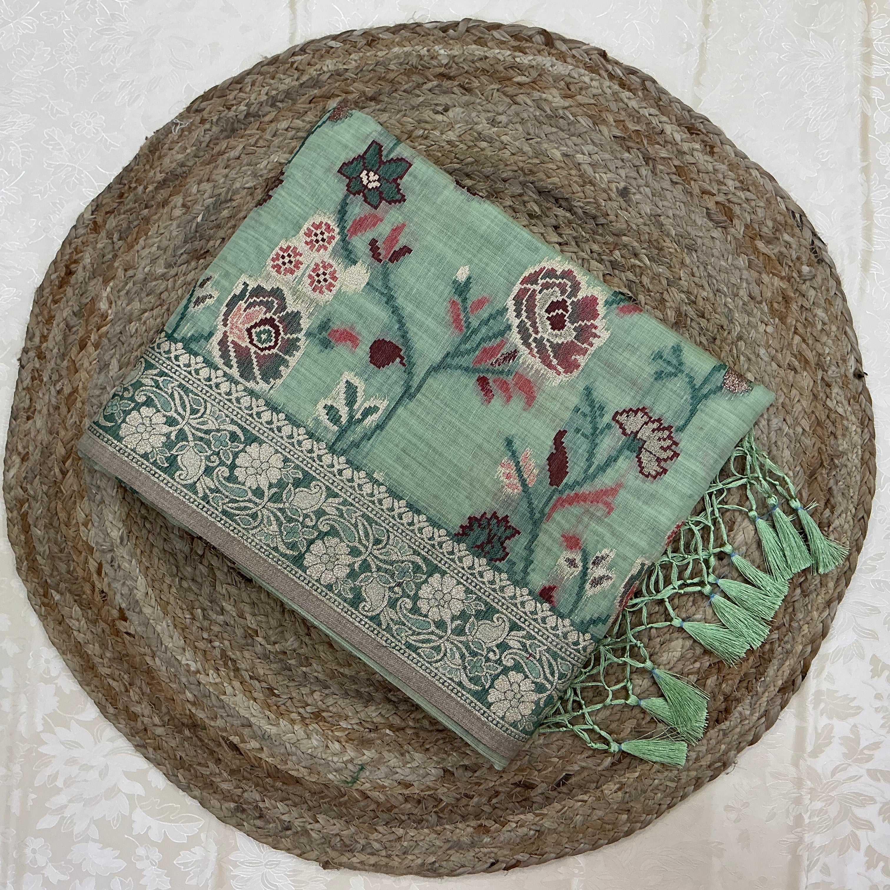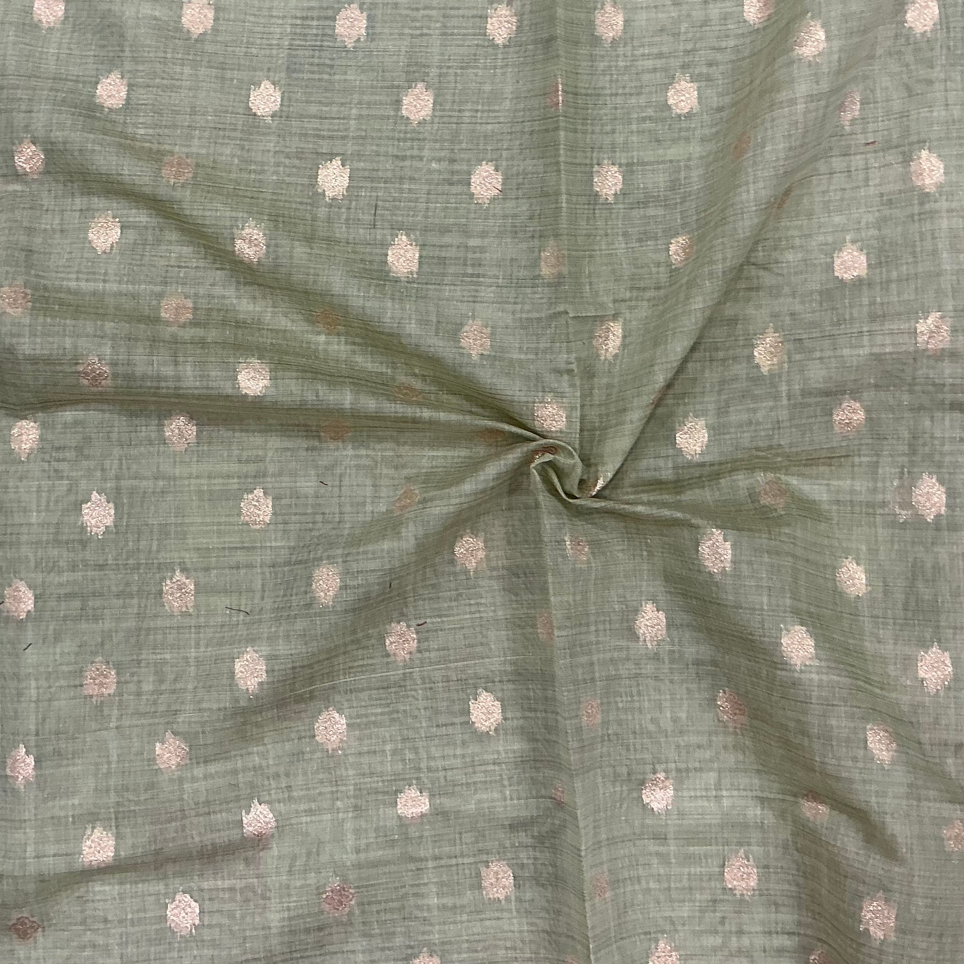 This exquisite moga cotton saree comes in a luxurious sage green shade that exudes sophistication and feminine grace. The body features beautifully woven floral jaal motifs in hues of maroon, rose pink, wine, emerald green, and soft beige., creating a charming tapestry of blooming vines. The subtle texture of the fabric adds depth and a refined handloom finish.
