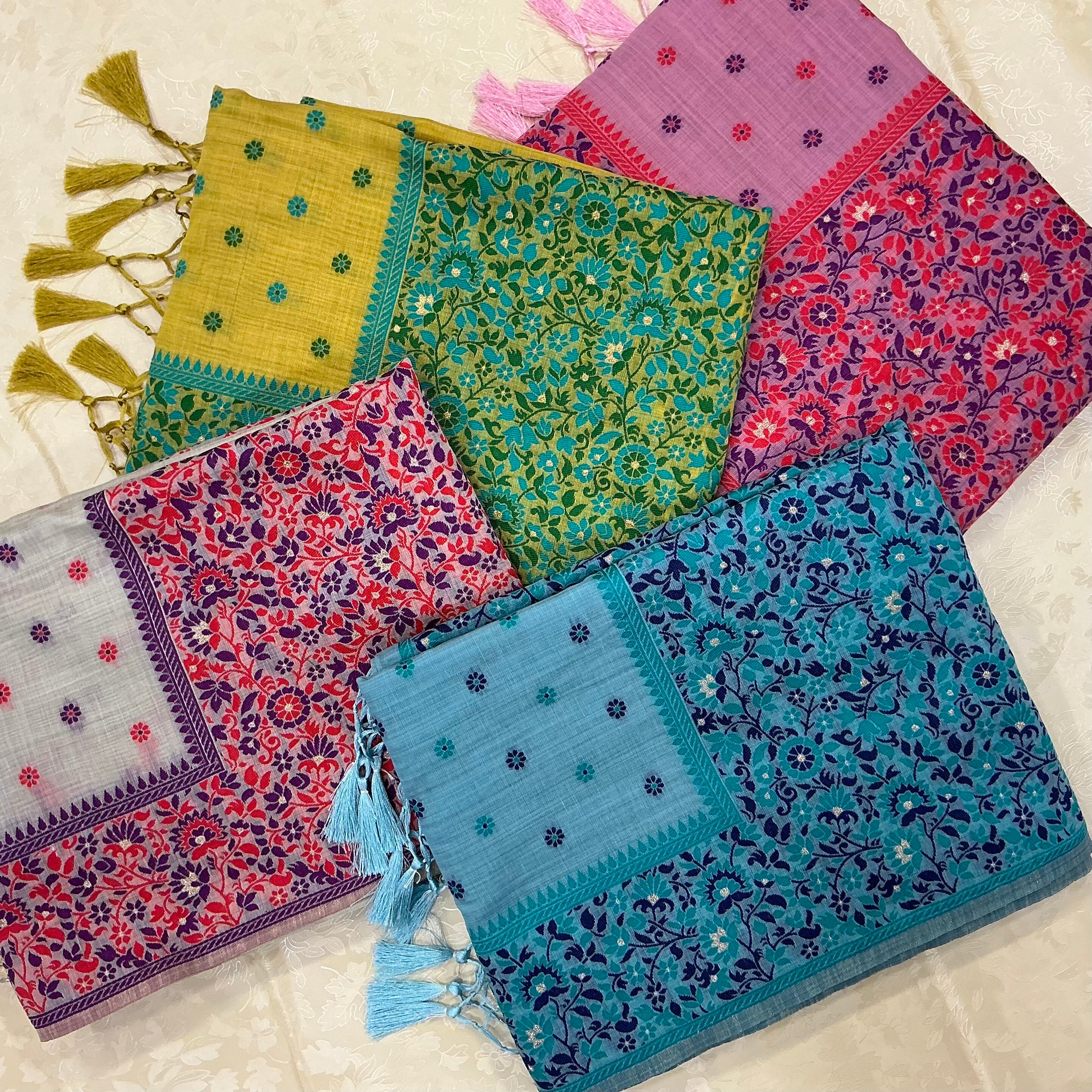 this stunning moga cotton saree comes in refreshing tones of rosy pink and magenta making it a perfect choice for women who love vibrant yet elegant colours. The body features a subtle aqua blue base adorned with tiny woven floral buttas in shades of magenta, red, and deep purple giving it a soft and graceful look.