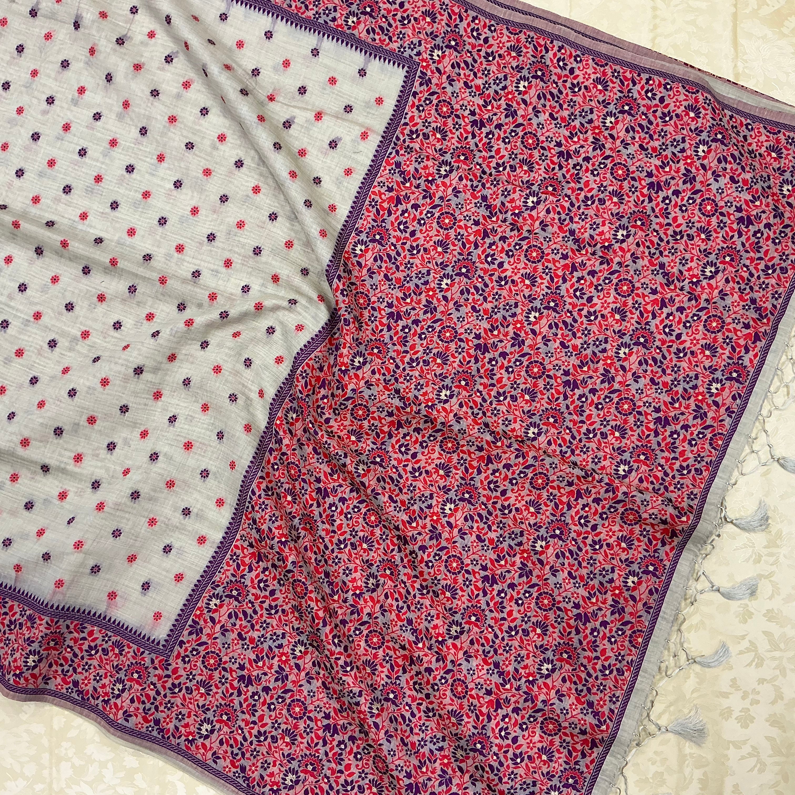 this stunning moga cotton saree comes in refreshing tones of soft ivory and vibrant pink–purple tones, making it a perfect choice for women who love vibrant yet elegant colours. The body features a subtle aqua blue base adorned with tiny woven floral buttas in shades of magenta, pink, and violet, giving it a soft and graceful look.