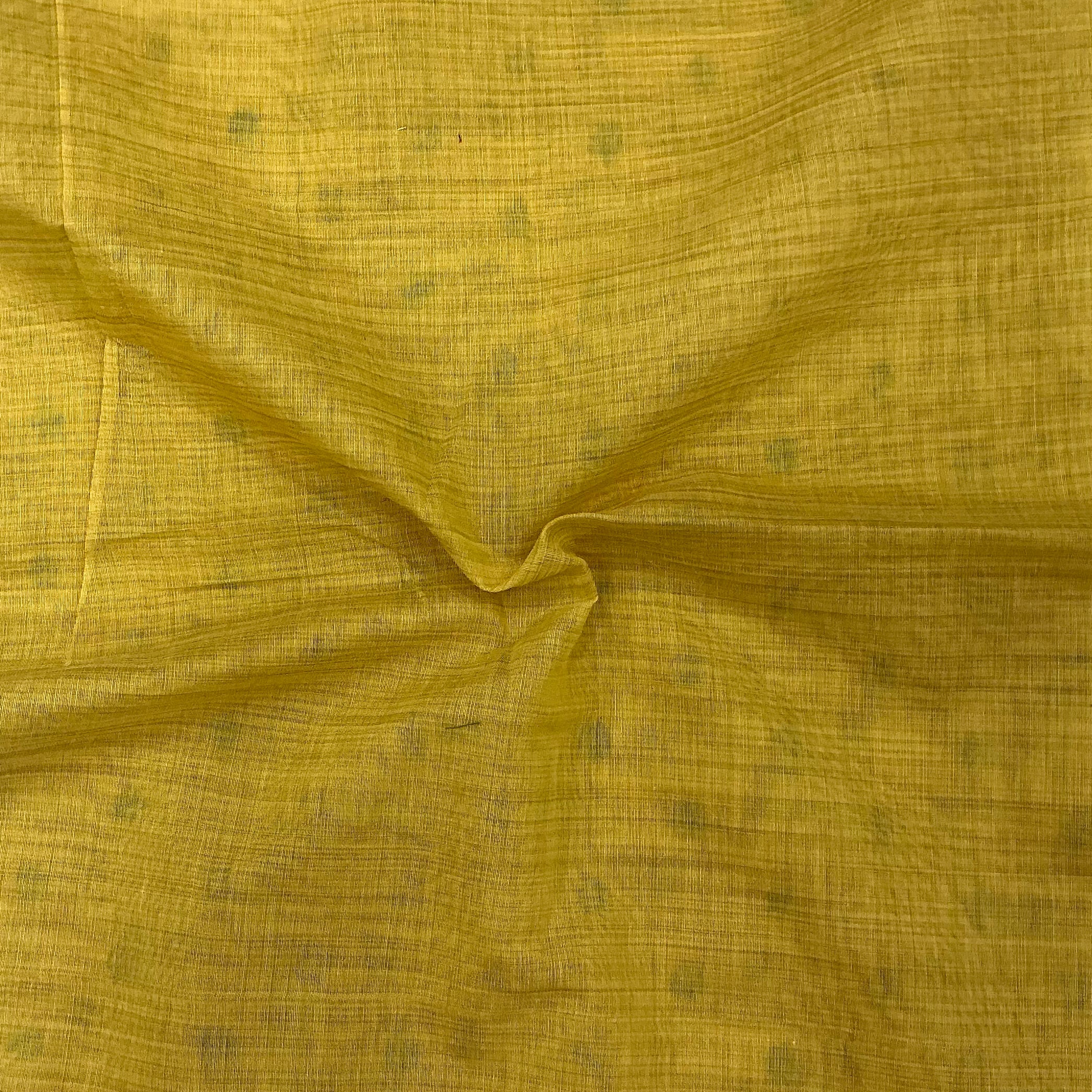 This stunning moga cotton saree comes in refreshing tones of mustard yellow and teal green, making it a perfect choice for women who love vibrant yet elegant colours. The body features a subtle aqua blue base adorned with tiny woven floral buttas in shades of teal, aqua, and soft green, giving it a soft and graceful look.