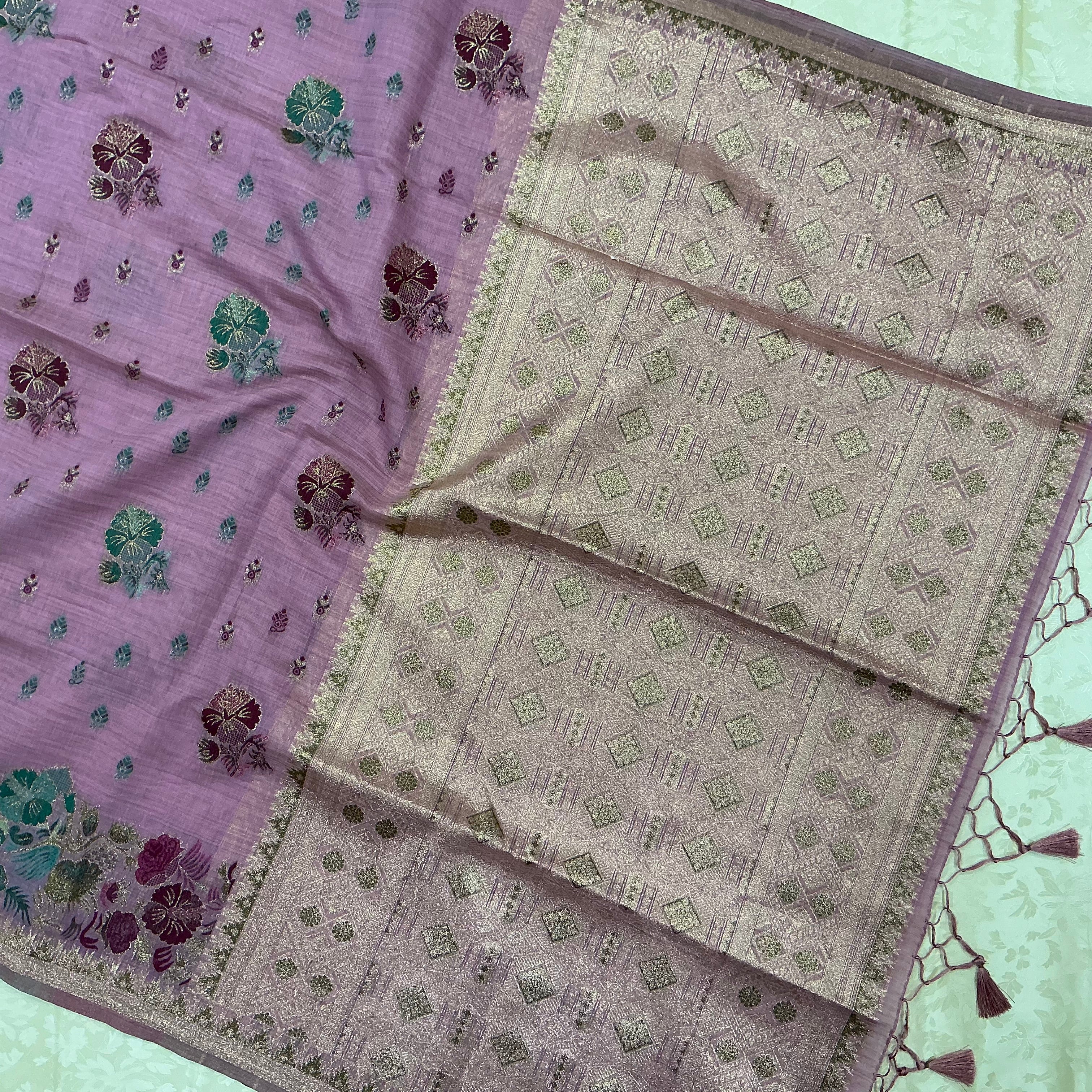 This elegant moga cotton saree is crafted in a pink shade shade, giving it a fresh and graceful appeal. The body features delicate woven floral motifs in shades of teal green, maroon, rose pink, and gold, adding a subtle yet charming touch of colour. The slight texture of the fabric enhances its traditional handwoven look.